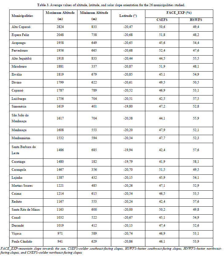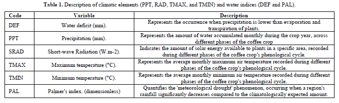 The influence of three groups of environmental variables was evaluated: (a) Climatic Factors-altitude, latitude, and slope orientation relative to the sun (Table 3); (b) Climatic Elements-PPT, SRAD, TMAX, and TMIN; and (c) Water Deficit Indices-DEF and PAL (Table 1), all related to the coffee phenological cycle (Table 2).