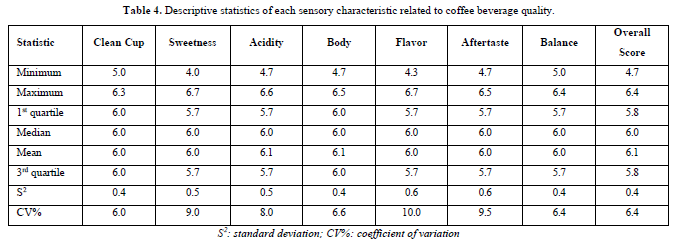 The following results present a comprehensive analysis of coffee quality in the Matas de Minas region, encompassing 26 evaluated municipalities. The assessment of sensory attributes provides insight into the key determinants of beverage quality, allowing for a precise characterization of the distinctive attributes of the beans cultivated in this region.