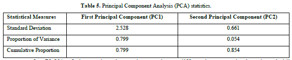 Principal Component Analysis (PCA) was applied to the sensory dataset to reduce dimensionality while preserving the most informative variables for coffee characterization. The first two principal components (PC1 and PC2) explained 85.4% of the total variance (Table 5), demonstrating the technique’s effectiveness in capturing the primary sensory attributes that define coffee quality.