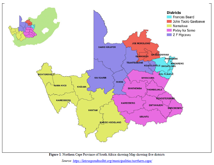 The Northern Cape, the largest province in South Africa, is characterized by its vast arid landscapes, unique topography, and a climate that presents both challenges and opportunities for agricultural practices and livelihoods. Figure 1 depicts the map of Northen Cape showing the five districts as the study area.