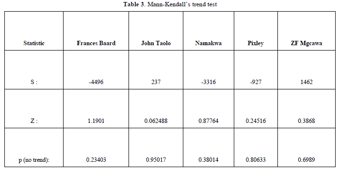 To statistically evaluate trends, the Mann-Kendall test was applied, with results presented in Table 3. The trend direction, as indicated by the S statistic, was negative for Frances Baard (S = -4,496), Namakwa (S = -3,316), and Pixley (S = -927), suggesting a potential decline in precipitation. Conversely, John Taolo (S = 237) and ZF Mgcawa (S = 1,462) displayed positive values, indicating a potential increase in rainfall over time. However, significance testing revealed that none of these trends were statistically significant, as all p-values exceeded the conventional threshold of .05. The highest p-value was observed in John Taolo (p = .950), confirming an absence of discernible precipitation trends in this district. Frances Baard (p = .234) and Namakwa (p = .380) had relatively lower p-values, though still not significant, suggesting that observed decreases in rainfall do not constitute a definitive trend. Pixley (p = .806) and ZF Mgcawa (p = .699) also exhibited non-significant p-values, reinforcing the conclusion that precipitation changes are likely due to natural fluctuations rather than an ongoing long-term trend. The findings from Figure 2 and Table 3 complement each other in understanding precipitation dynamics in the region. While the precipitation plots visually suggest potential variations in rainfall patterns, the Mann-Kendall test results confirm that these variations do not meet statistical significance criteria. The slight negative trends in Frances Baard and Namakwa, as indicated by the Mann-Kendall test, align with the fluctuations observed in Figure 2, where these districts demonstrate notable rainfall variability. However, the lack of statistical significance across all districts indicates that precipitation levels do not exhibit a definitive increasing or decreasing pattern over time. The absence of significant trends suggests that precipitation in the Northern Cape remains highly variable, requiring continued monitoring to assess potential long-term climatic shifts. The observed negative values in Frances Baard and Namakwa may indicate a potential risk of decreasing rainfall, though further longitudinal analysis is needed to confirm the persistence of these trends. Given the high variability seen in Figure 3, particularly in Frances Baard and John Taolo, adaptive water management strategies should be implemented to mitigate uncertainty in rainfall patterns.