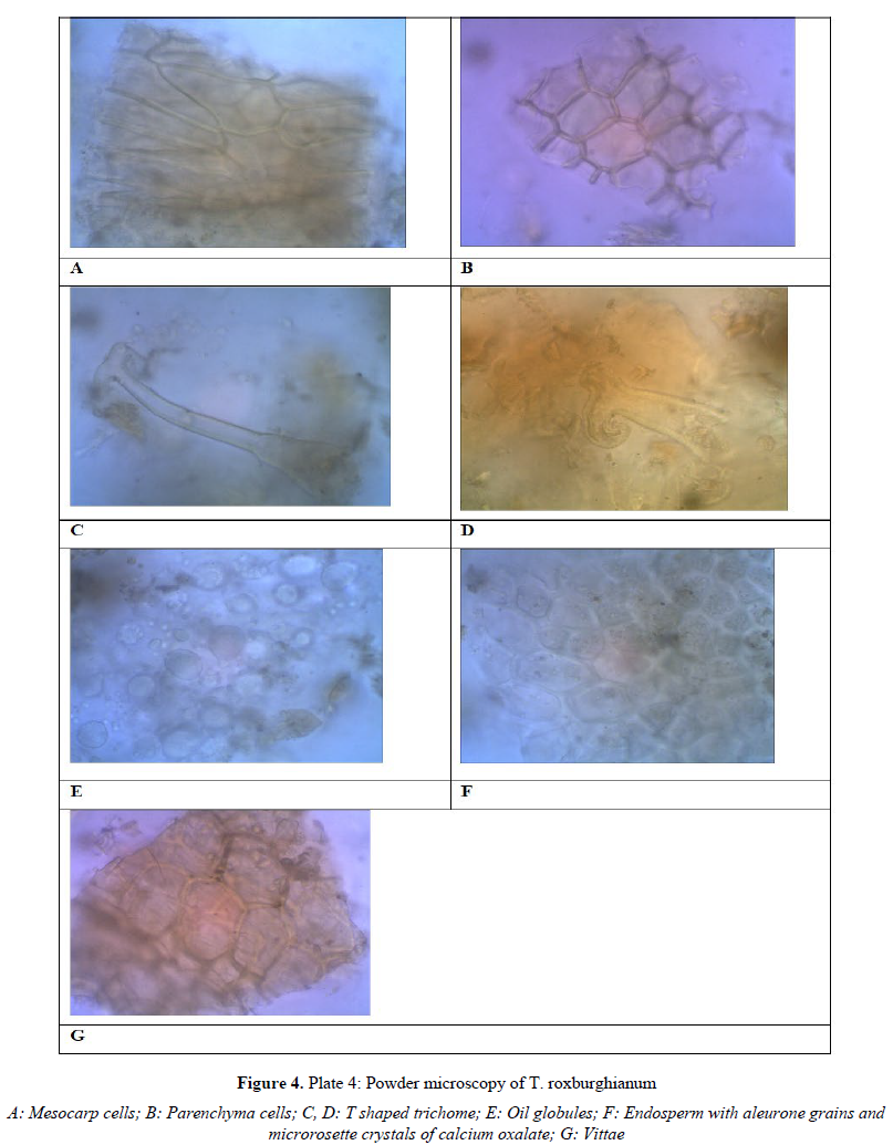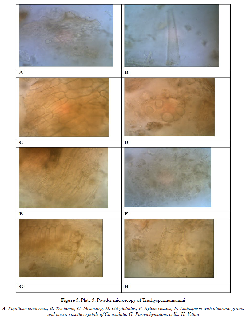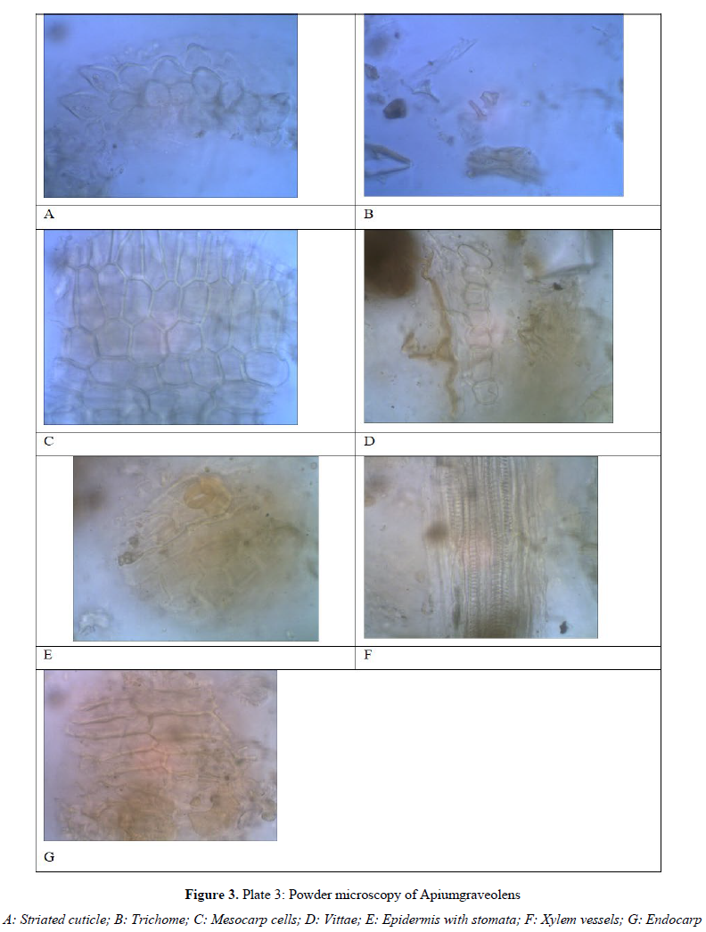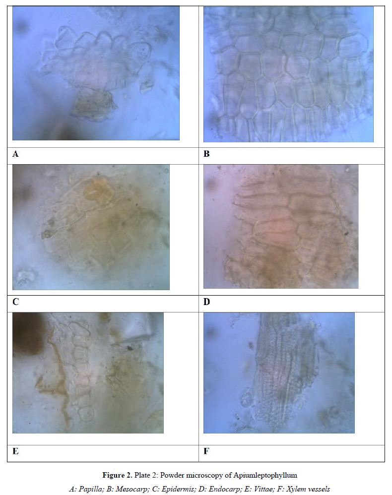 The macroscopical characters of the fruits were noted following standard procedure. For powder microscopy study, the powder was stained with phloroglucinol and concentrated HCl to study the lignified cells, trichomes, fibres, xylem vessels, vittae, oil globules, endosperm etc. The powder was also stained with N/50 iodine solution to detect the presence of starch. A small portion of powder was mounted in water to identify Calcium Oxalate crystals. Microscopy of the fruits was carried out by the methods prescribed by Trease and Evans (1983).