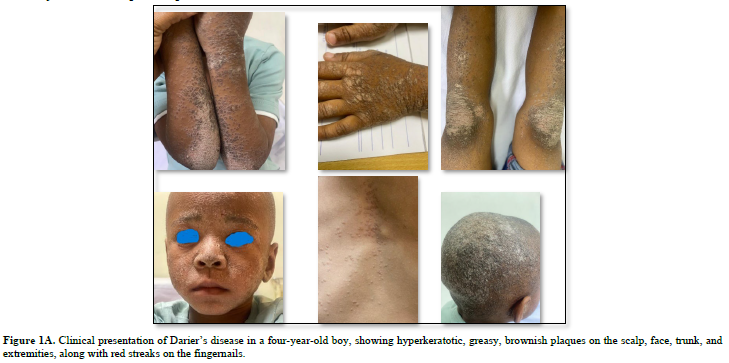 Conclusion: This case highlights a sporadic presentation of Darier’s disease in a pediatric patient, underscoring the importance of clinical recognition and histopathologic confirmation for timely intervention. Despite its rarity, the psychosocial impact and recurrent nature of the disease necessitate long-term management strategies.
