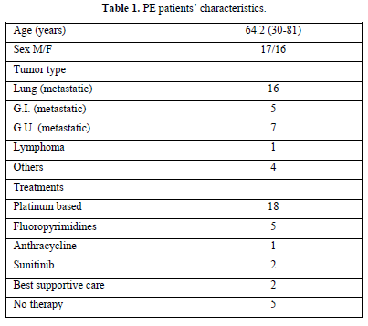 We analyzed the files of 422 patients (193 women, 229 men; mean age, 67 years). All 422 patients had a DD value higher than 500 ng/mL, and 33/422 (7.8%) PE events were detected: CTPA evidence of filling defects in 32 cases and high probability of lung perfusion scintigraphy in 1 case. We found a DD value greater than 800 ng/mL (range 816-3884) in all 33 patients with PE: 1 patient had lymphoma, 32 patients had metastatic disease (Table 1). Among patients with PE, 73% showed abnormal pulmonary artery pressure (PAP) values (PAP greater than 35 mmHg) estimated from echocardiographic Doppler study (range 37-100 mmHg) and 53% echocardiographic right ventricular dilatation (Table 2). None of the patients had a “high risk” clinical presentation of shock or hypotension at admission, all patients had a diagnostic work-up before CT.