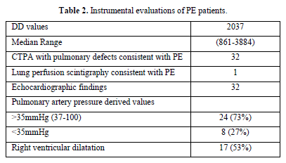Results: Among all patients with DD values>500 and CTPAs, we observed 33/422 (7.8%) radiological evidence of PE. Patients with PE had a DD value greater than 800 ng/mL (range: 816-3884).