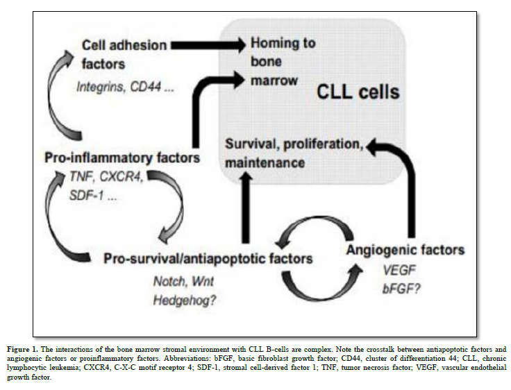 Abbreviations: BFGF: Basic Fibroblast Growth Factor; BM: Bone Marrow; CD44: Cluster of Differentiation 44; CLL: Chronic Lymphocytic Leukemia; CXCR4: C-X-C Motif Receptor 4; FDC: Follicular Dendritic Cells; IRF4: Interferon Regulatory Factor 4; MSC: Mesenchymal Stem Cell; SDF-1: Stromal Cell-Derived Factor 1; TNF: Tumor Necrosis Factor; VEGF: Vascular Endothelial Growth Factor