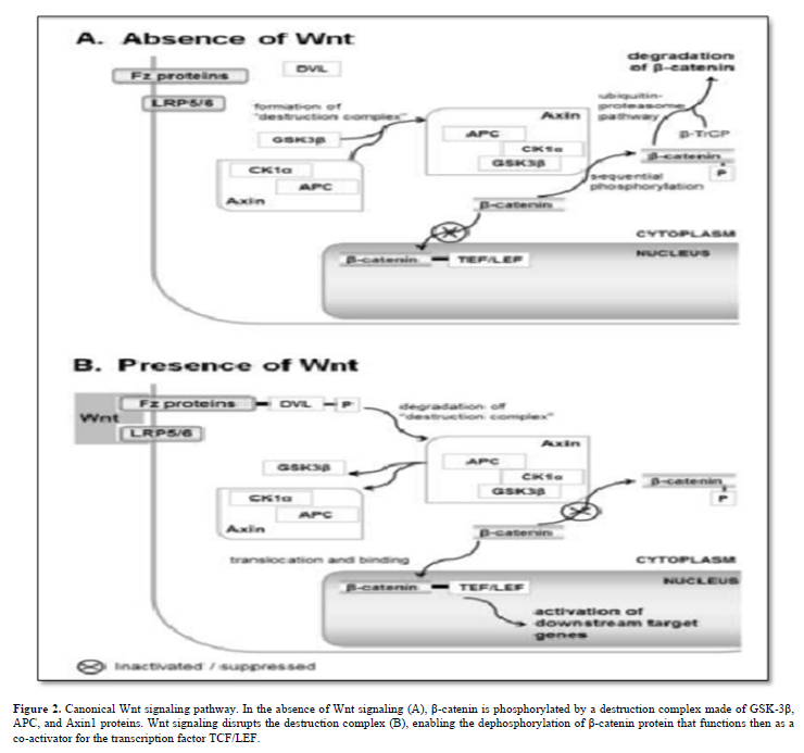 The canonical Wnt/β-catenin pathway centers on β-catenin, encoded by the CTNNB1 gene. Without Wnt signaling, a destruction complex (GSK-3β, APC, and Axin1) phosphorylates β-catenin. Wnt activation disrupts this complex, allowing unphosphorylated β-catenin (at Ser 37 or Thr 41) to accumulate and co-activate the transcription factor TCF/LEF (T-cell factor/lymphoid enhancer factor). Figure 2 simplifies the current Wnt signal transduction model.