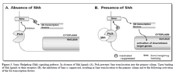 A prevailing hypothesis suggests that in the absence of Hh ligands, Ptch inhibits Smo translocation into the primary cilium by modulating the production and/or transport of small molecules such as oxysterols [8]. Typically, when Hh ligands bind to their receptors, this inhibition of Smo is alleviated. Subsequently, Smo relocates to the primary cilium and activates members of the Gli protein family as depicted in Figure 3.